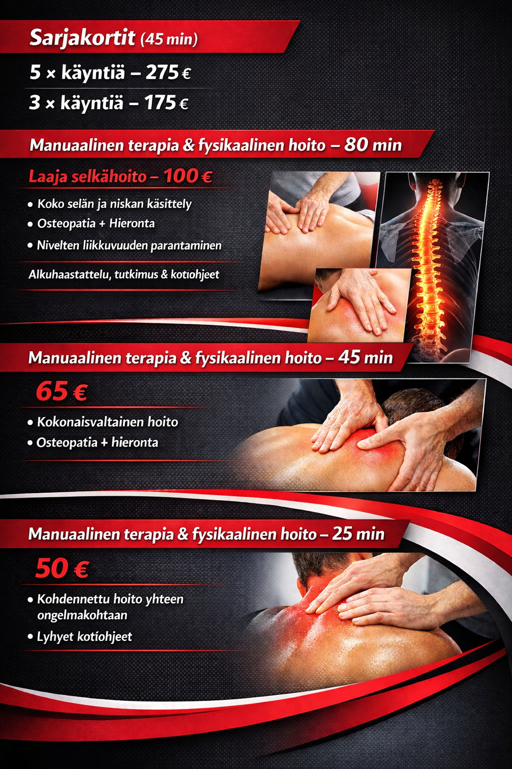 Meillä maksat ainoastaan hoitoajasta, joka sisältää muun muassa selkäklinikalla tehtävät tutkimukset, ortopediset ja neurologiset testit, manuaalisen terapian ja fysikaaliset hoitolaitteet hoitosuunnitelman mukaan. Pääsääntöisesti kaikki terapeutin sinulle tarjoamat hoidot sisältyvät samaan hintaan – Kaiken tavoitteena on, että kipu hellittää ja kroppasi palautuu tasapainoon.