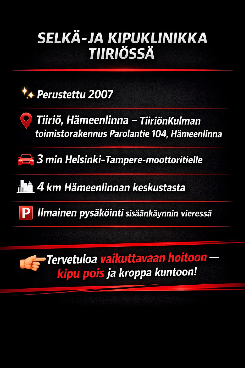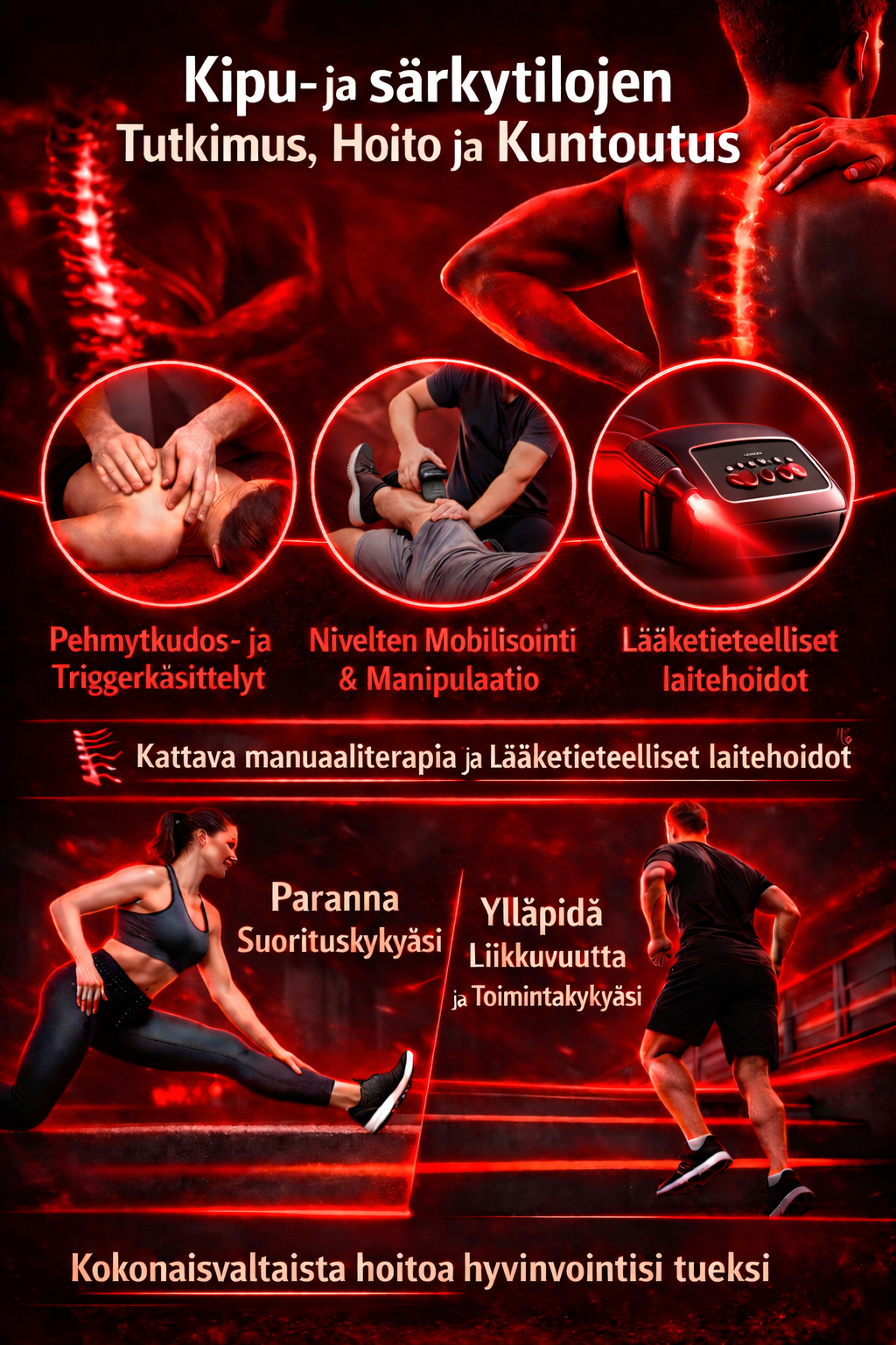 Tarjoamme asiakkaillemme yksilöllistä ja korkealaatuista hoitoa, jossa keskitymme erityisesti toimintahäiriöiden ja kiputilojen kokonaisvaltaiseen hoitoon. Jokainen asiakas kohdellaan yksilöllisesti, ja heidän tarpeensa otetaan tarkasti huomioon.