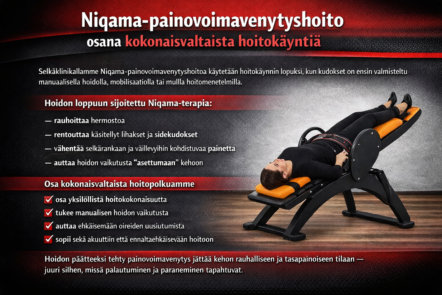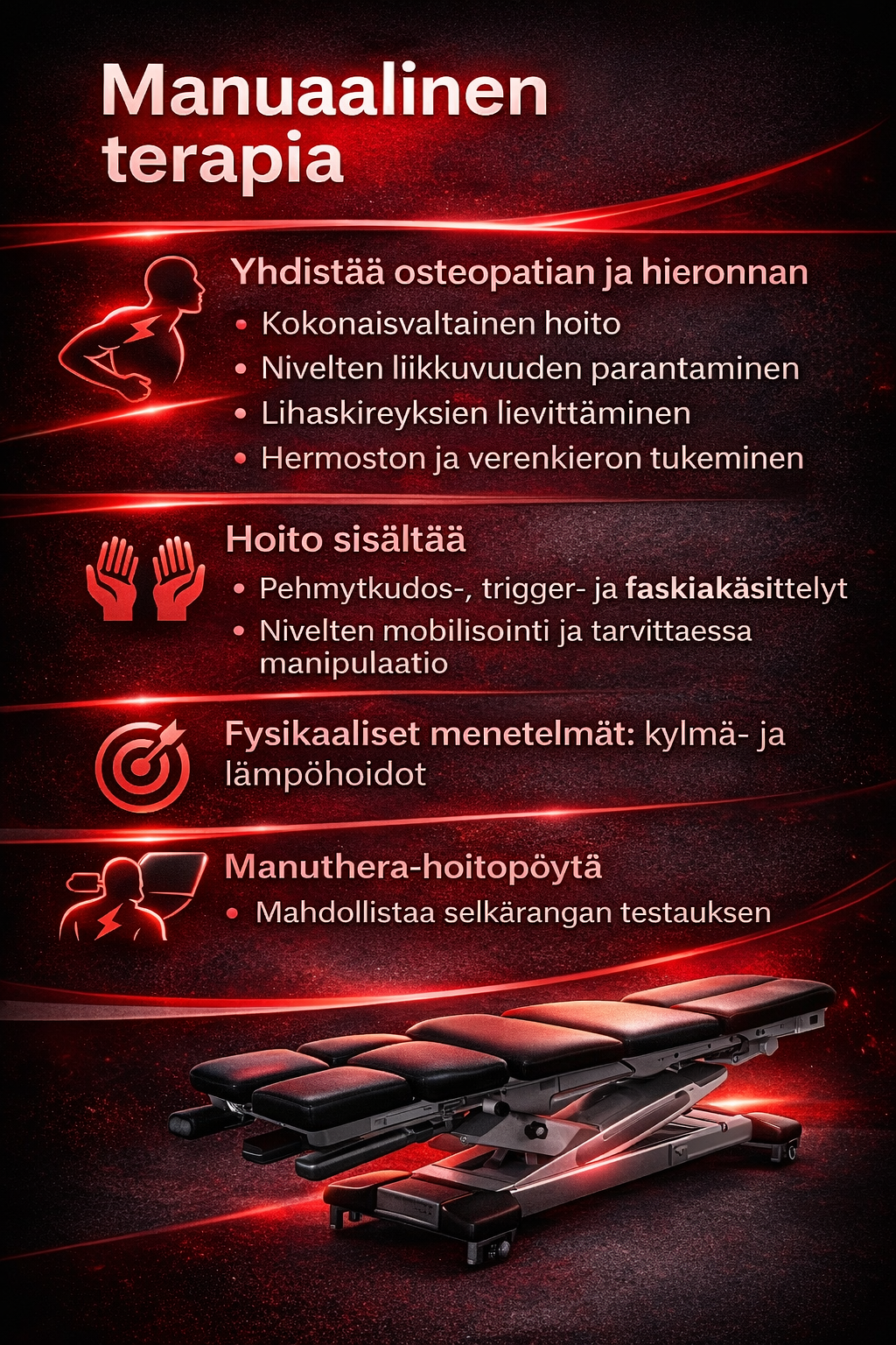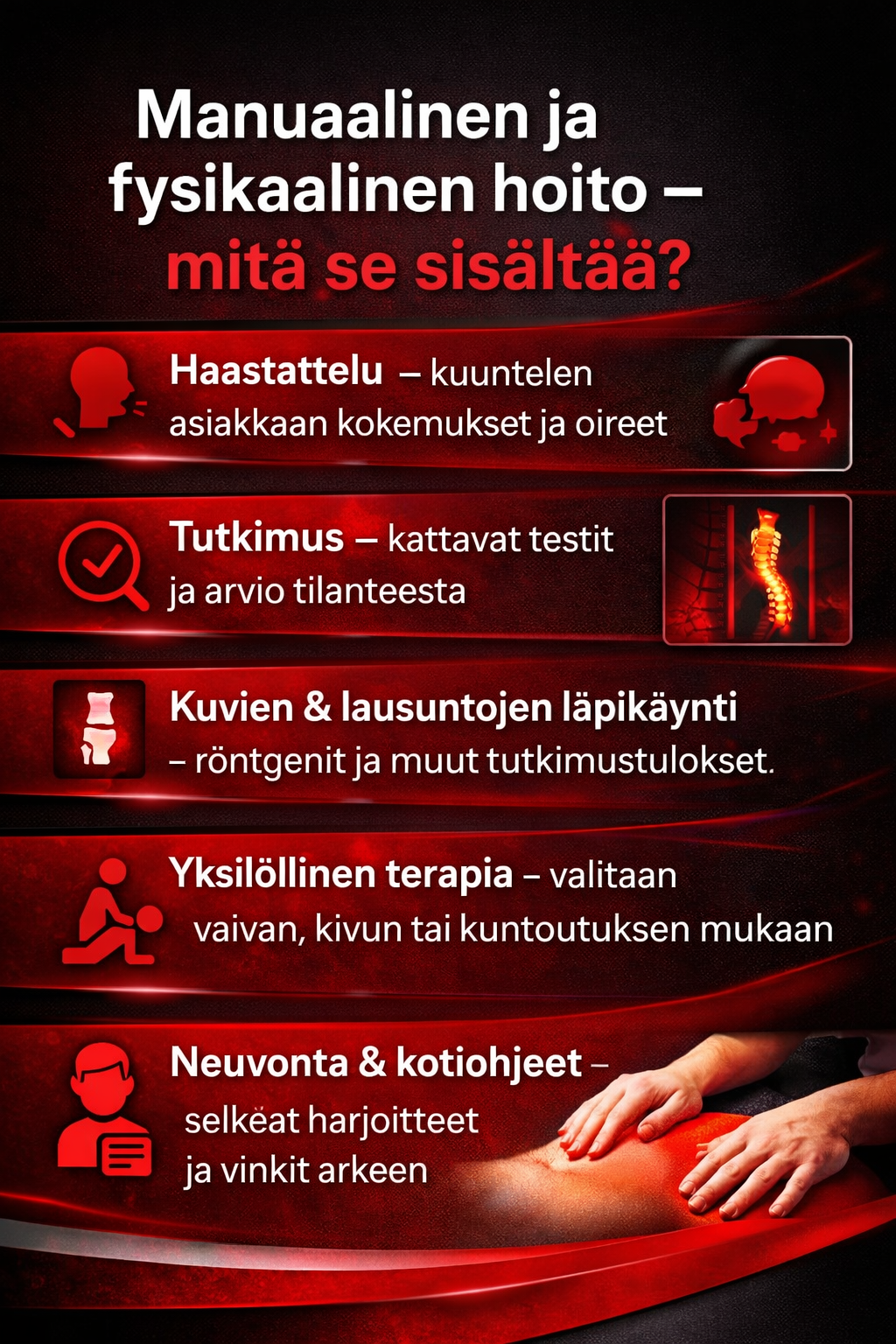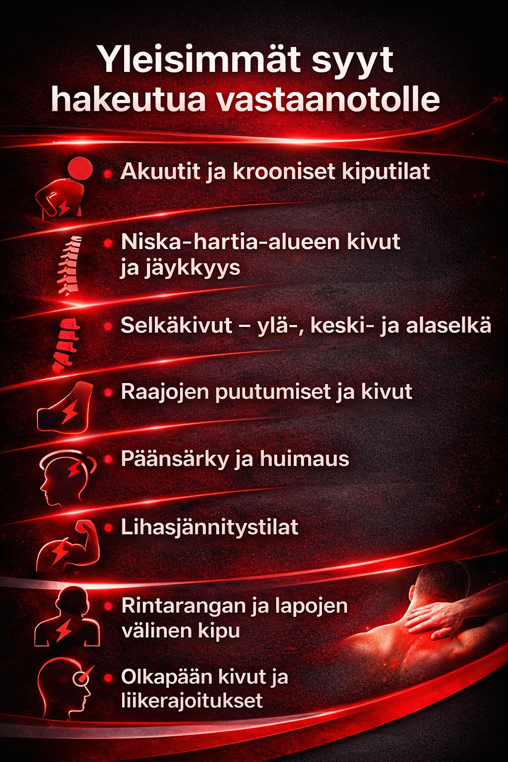 Jos haluat eroon säryistä, kivuista, vaivoista tai parantaa suorituskykyäsi ja hyvinvointiasi, ota meihin yhteyttä. Me teemme kaikkemme auttaaksemme sinua.